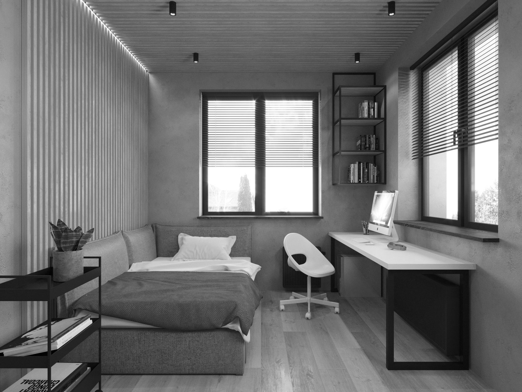 Зазвичай ми не беремось за дизайн одного приміщення, так як інтер’єр це загальне сприйняття та враження від простору в цілому. В даному випадку ми пішли на зустріч замовнику, так як власник кімнати – це підліток, якому було важливо отримати сучасний інтер’єр, в якому йому буде комфортно навчатись та відпочивати.