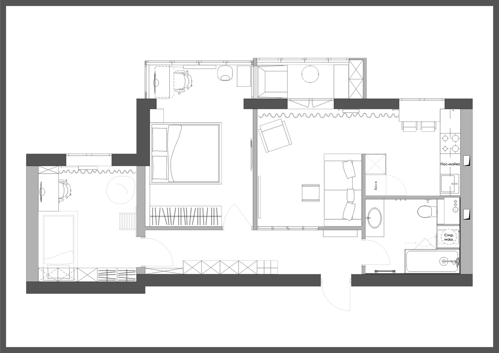 Основним завданням було створення функціонального простору для життя молодої пари. Після перепланування замовник отримав повноцінне двомісне ліжко з комфортним місцем для читання, та вітальню з великим диваном трансформером + обідню зону зі столом на 4 персони. Місце приготування та зберігання продуктів перетворилось в кухню – нішу з додатковою вентиляцією та природним освітленням завдяки скляній перегородці. Ванна кімната вмістила в собі все необхідне, навіть "пральню", вбудовану за фасадами. Щодо місць зберігання, було запроектовано вбудовану шафу, яка приховує вхід до гардеробної. Одним із прийомів було використано різні сценарії освітлення, які вдало створюють настрій у будь-який час доби.